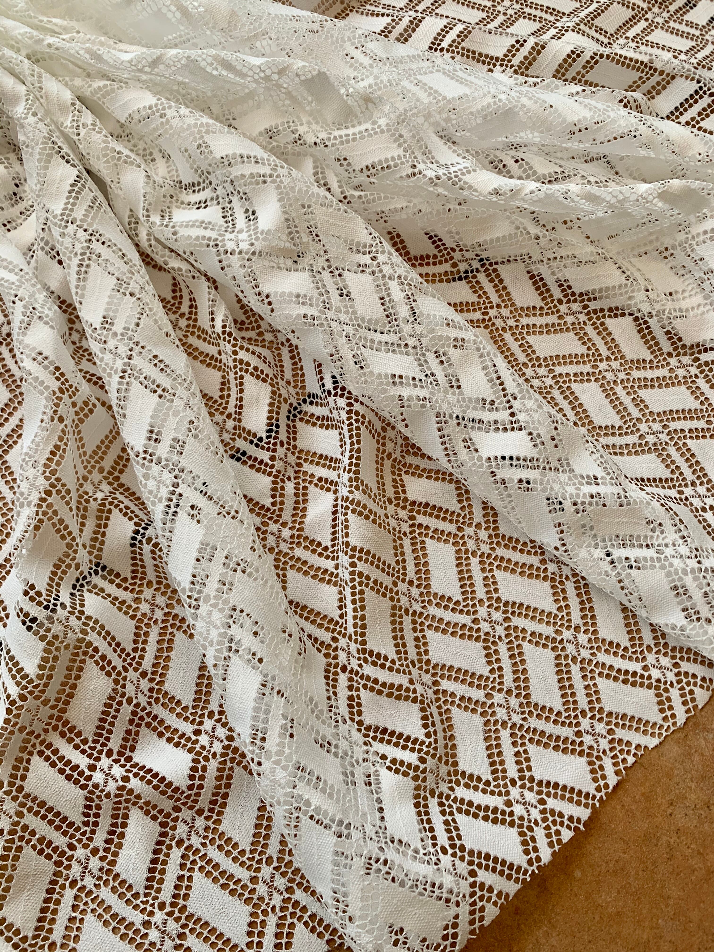珍しいポリエステル/ポリウレタンのストレッチレースです。抽象的で小さめのモチーフは、洋服以外にも、小物作りや、マスクなどにもオススメです。